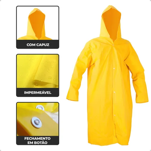 A Capa de chuva é Confeccionada em PVC com forro de poliéster com mangas longas, capuz, fechamento frontal com quatro botões plásticos de pressão. Ideal para ser usado em atividades em frigoríficos, no tratamento de efluentes (esgoto), saneamento, lavagem de máquinas e/ou automóveis e dias chuvosos.
